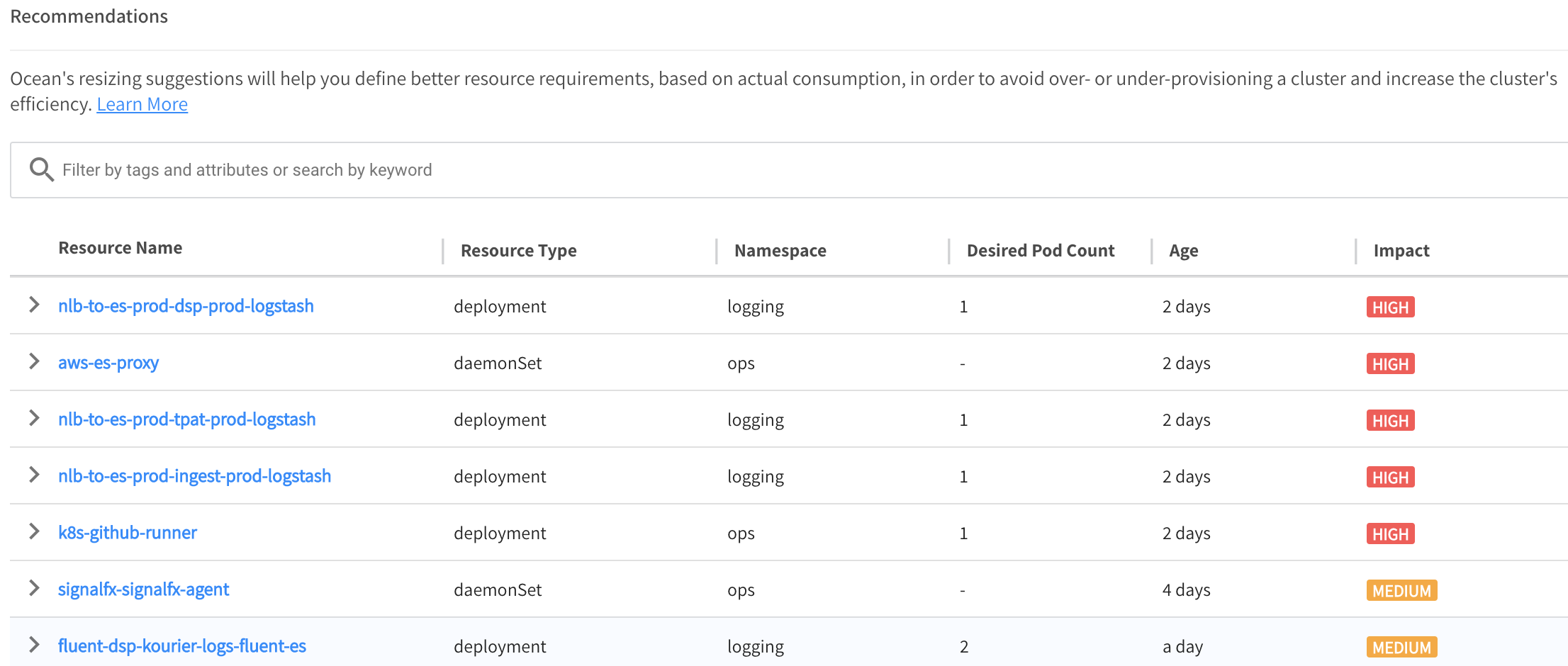 Ocean monitors workload utilization in real-time and provides recommendations for adjusting the resource requirements for different workload types.