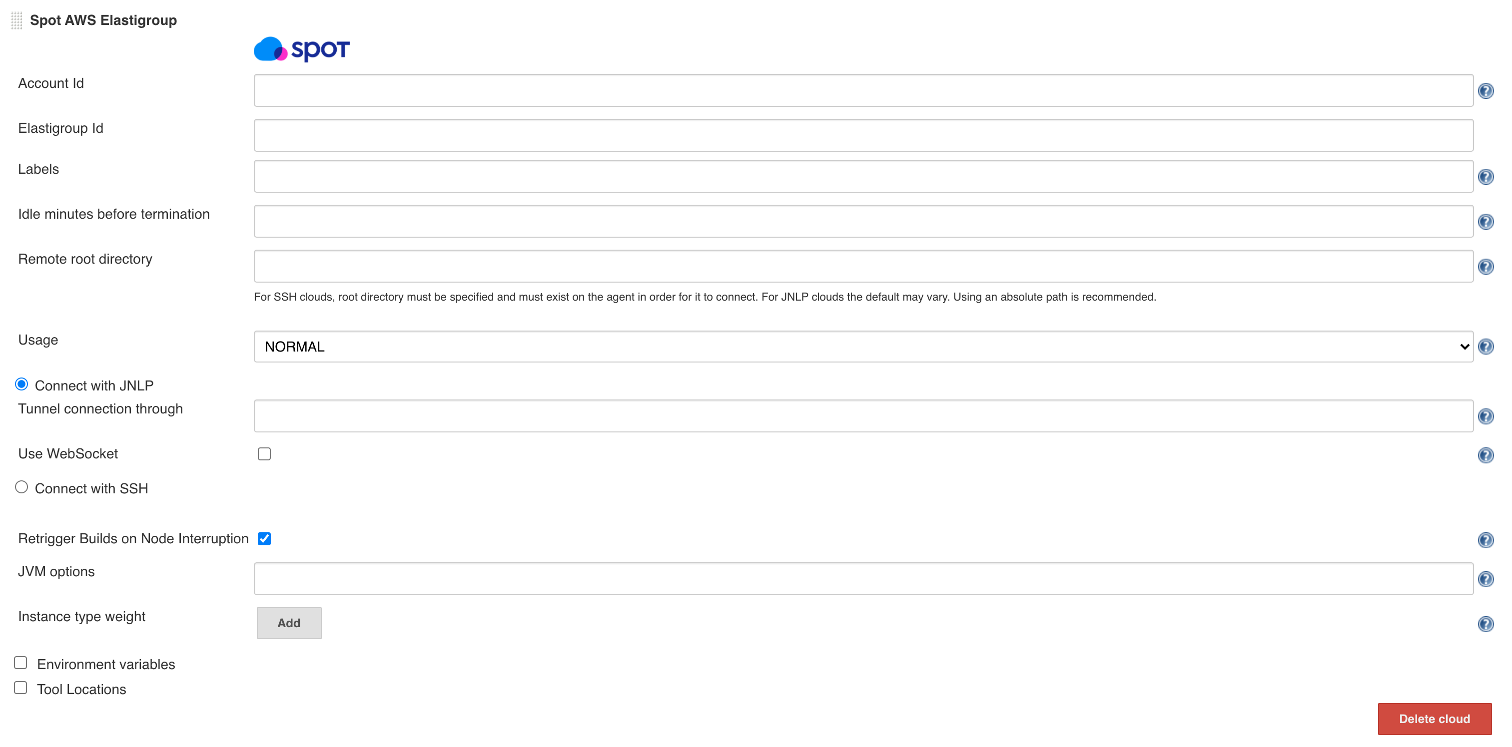 Go to Manage Jenkins > Configure Nodes and Clouds > Configure Clouds in the left pane. Click on Add a new cloud and select the cloud provider connected to the Spot account being used (you can more than one cloud, each specifying its own Elastigroup and Account IDs).
